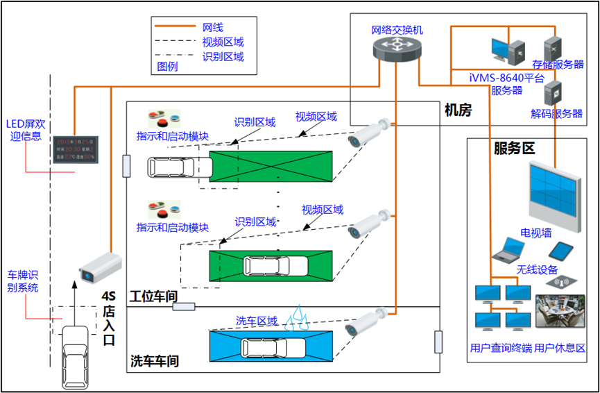 系統集合多種視頻監控業務,包括4S店出入口管理、工位車間監控、洗車車間監控、平臺管理以及大屏展示等。采用140萬/200萬CCD高清一體化攝像機為采集主體,完成對出入口數據采集、工位車間的實時監控、洗車車間的出入抓拍,提供平臺管理服務、大屏顯示上墻等。系統涵蓋4S店所有視頻監控業務需求。